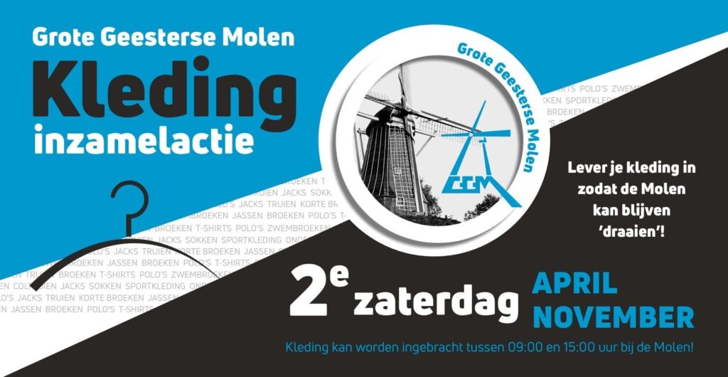 Op zaterdag 8 november zijn er van 9:00 tot 15:00 uur bestuursleden aanwezig om herbruikbare kleding of schoeisel in ontvangst te nemen. De kleding dient schoon en onbeschadigd te zijn en schoeisel dient aan elkaar te worden bevestigd (bijvoorbeeld met de veters). De kleding moet hergebruikt kunnen worden en levert ons geld op. De opbrengst wordt besteed aan de restauratie van de molen.
